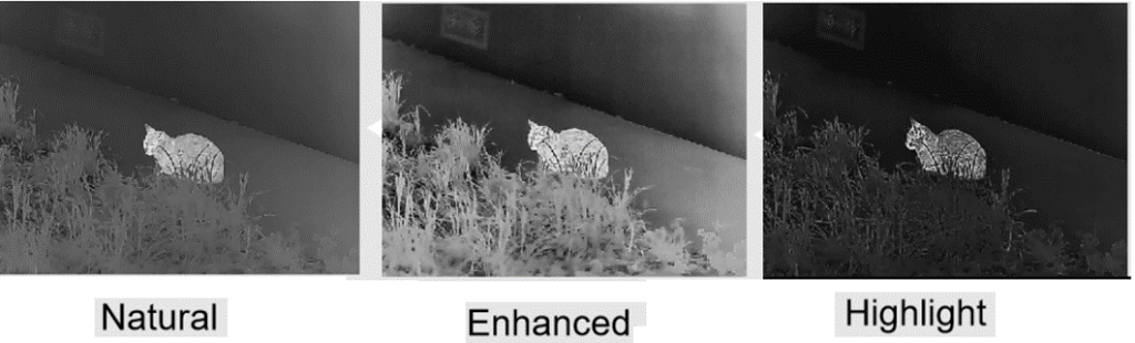 В тепловизоре Guide TK621 предусмотрена возможность применения одного из трех визуальных эффектов (Enhanced, Highlight или Natural). В каждом из них предусмотрены индивидуальные настройки чувствительности и уровня подавления шумов.