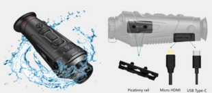 Корпус цилиндрической формы изготовлен из прочных полиамидных материалов и надежно защищен от проникновения влаги. Имеется гнездо UNC ¼"-20 для крепления тепловизора на штатив или планку Пикаттини.
